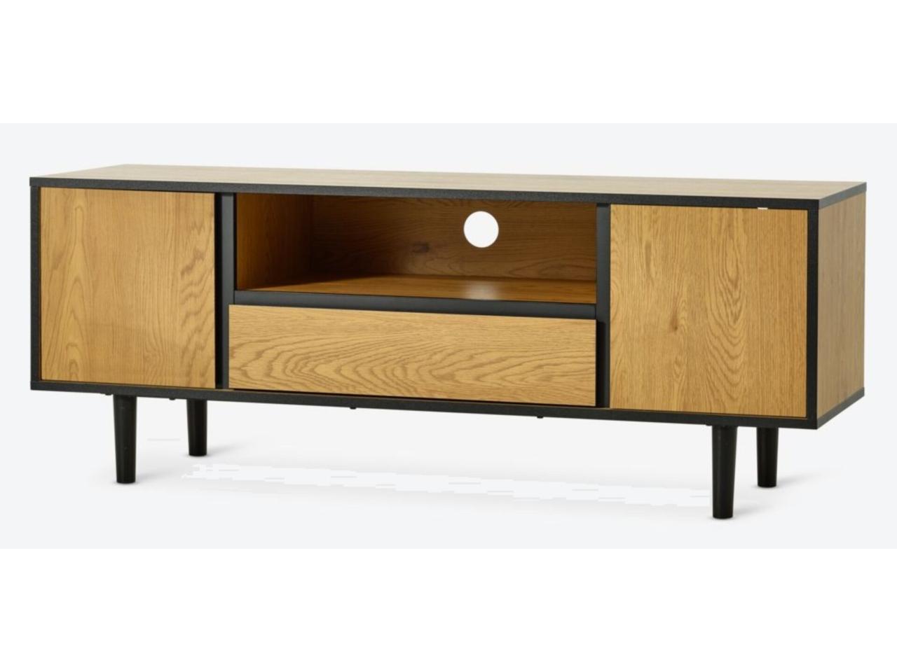 * Mueble TV ODENSE 2 puertas 1 cajón color roble cálido/negro. De materiales Pino macizo y chapa de roble natural sobre pino macizol. A130 x A50 x P40 cm