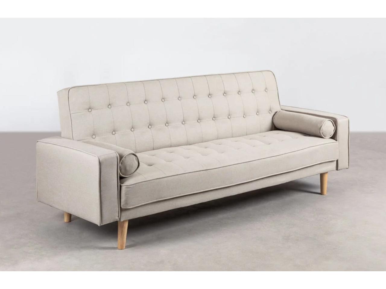 *Sofá cama de 3 plazas Brion. En el Sofá cama de 3 plazas Brion se unen a la perfección, el estilo nórdico con un toque vintage gracias a su tapizado en poliéster con acabado en capitoné. Una pieza de líneas rectas y simples que lo dotan de una elegancia sin excepción. Incluye 2 cojines desenfundables laterales de forma cilíndrica que junto a su relleno de espuma reciclada de 50 kg/m³ hacen de este, una apuesta segura en cuanto a comodidad se refiere. Su estructura está fabricada en madera de eucalipto y sus patas en madera de caucho, lo que garantiza la robustez y resistencia apta para el uso diario. Cuenta con tacos de fieltro en sus patas. Gracias a su respaldo reclinable en varias posiciones se adapta perfectamente a nuestro día a día. Gracias a su versátil diseño hace que combine con cualquier estilo. Te permite convertirlo en una cama supletoria perfecta para visitas imprevistas de montaje rápido con un simple movimiento. Medidas: Alto: 88 cm - Ancho:216 cm - Profundo:80 cm - Altura Patas:18 cm - Altura Asiento:42 cm - Altura del Reposabrazos:57 cm