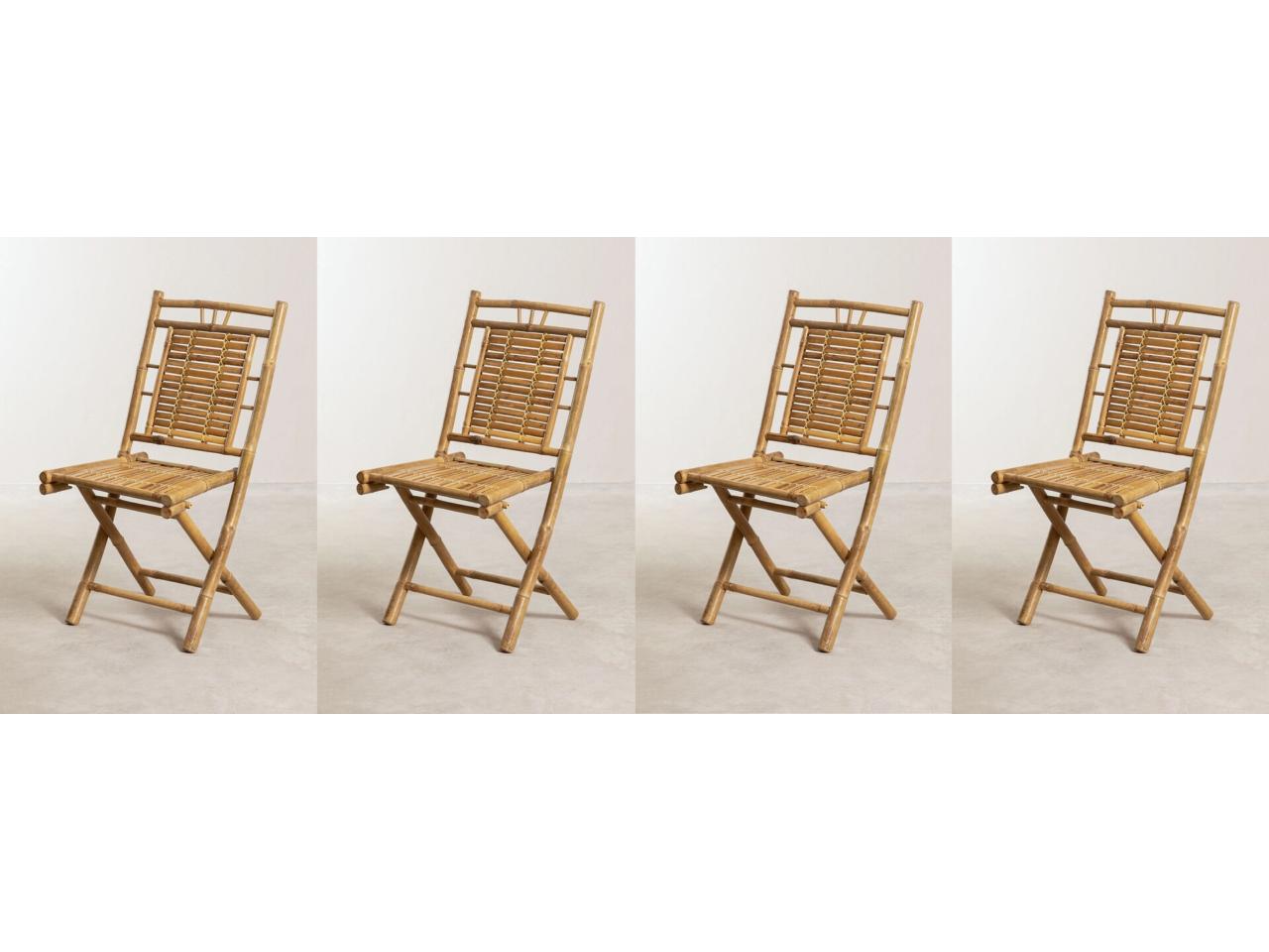 *4 sillas Silla plegables en bambú Yakku. Silla de comedor plegable en bambú Yakku. Las Sillas plegables en bambú Yakku crea un ambiente fresco y natural. Con un diseño cuidadosamente elaborado, esta silla destaca por su estilo rústico y acogedor. Su estructura está fabricada en bambú de alta calidad, aportando una estética ligera y resistente. El asiento y el respaldo ofrecen una comodidad sorprendente debido a la flexibilidad y adaptabilidad de su material. Las líneas sencillas y la cálida tonalidad del bambú hacen que esta silla sea un complemento versátil, capaz de integrarse con facilidad en diversas decoraciones. Al ser plegable, puedes guardarla sin ocupar espacio y sacarla solo cuando la necesites.