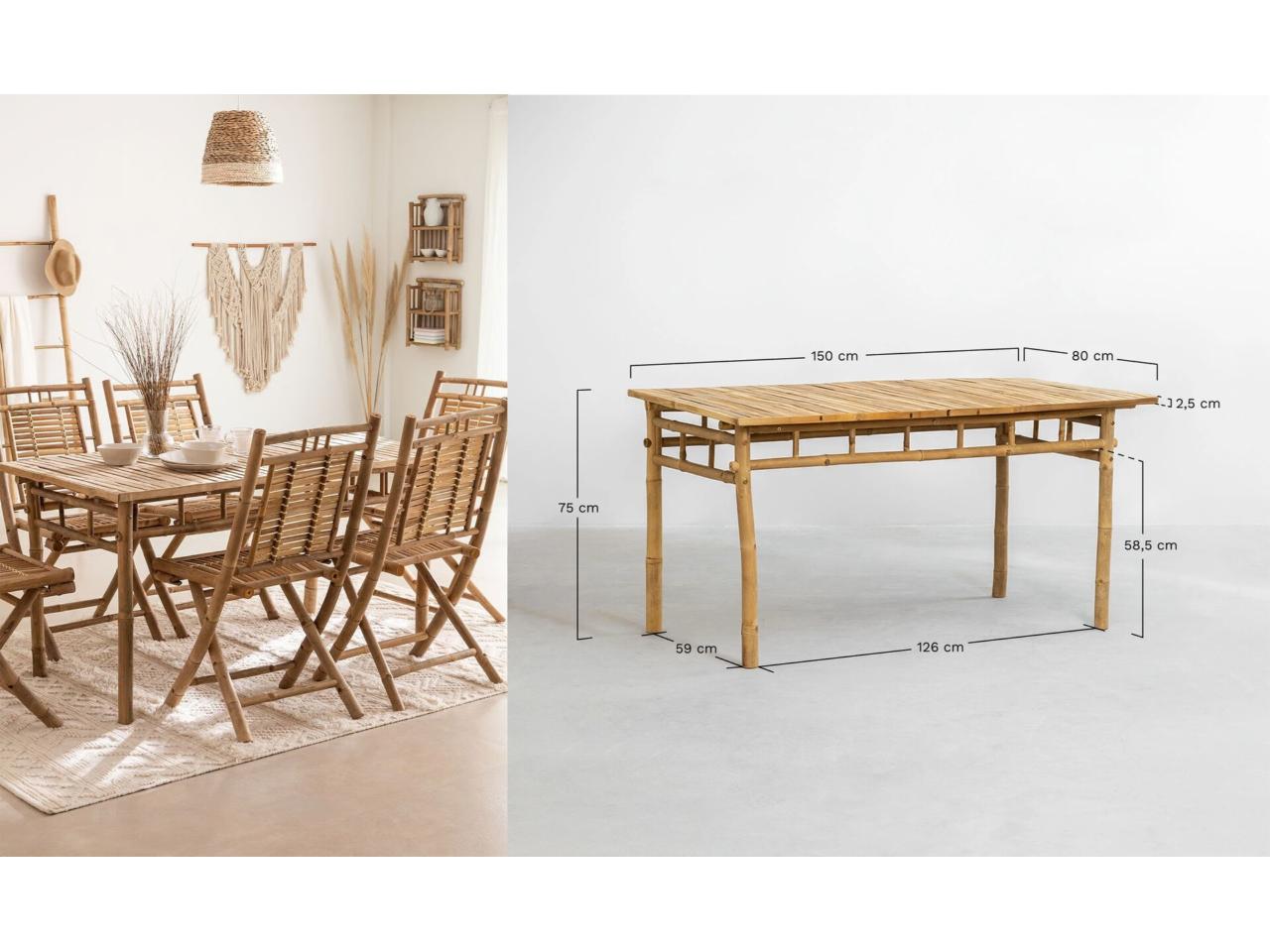 * Mesa Rectangular en Bambú (150x80 cm) Marilin. La Mesa de Rectangular en Bambú Marilin tiene un exclusivo diseño y su fabricación es en bambú. Aporta un toque exótico y natural a la decoración de terraza o jardín. Es un mueble sostenible con acabados naturales y sin tratamientos químicos, conservando las marcas e irregularidades del propio material. Disfruta rodeado de familiares y goza de ricas comidas o cenas en la mesa Marilin.